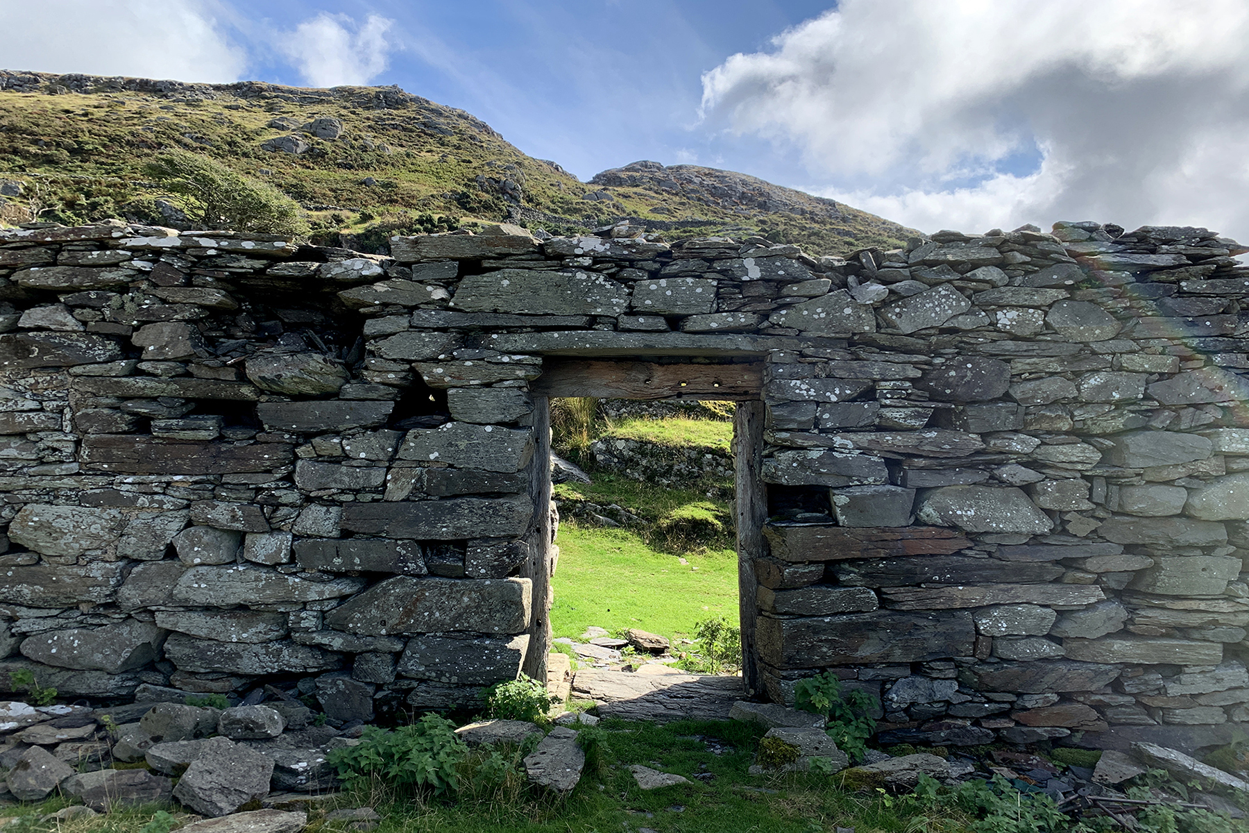 Water levels replenished, and strength regained I made my way onwards and as the morning got ever sunnier I came to a place called Gellfechan or Cell-fechan (meaning small cell) – the ruins of an old farmstead, high and isolated on the grassy uplands. This was easily the highlight of my hike – I had no prior knowledge that it even existed and so its discovery was naturally a complete surprise. The site comprises the main farmhouse, and several barns and outbuildings, their crumbling, grey stone remains, intricately adorned with mosses and lichens. Notwithstanding the inevitable poignancy that always seems to accompany the ruins of old buildings, it really is a beautiful place, and given its fairly remote situation I imagine it’s not particularly well-known. It was still in use up until the 1950s, but you’d be forgiven for thinking it had been abandoned long before that, given how its exposed location has left it at the mercy of the elements, I suppose.
